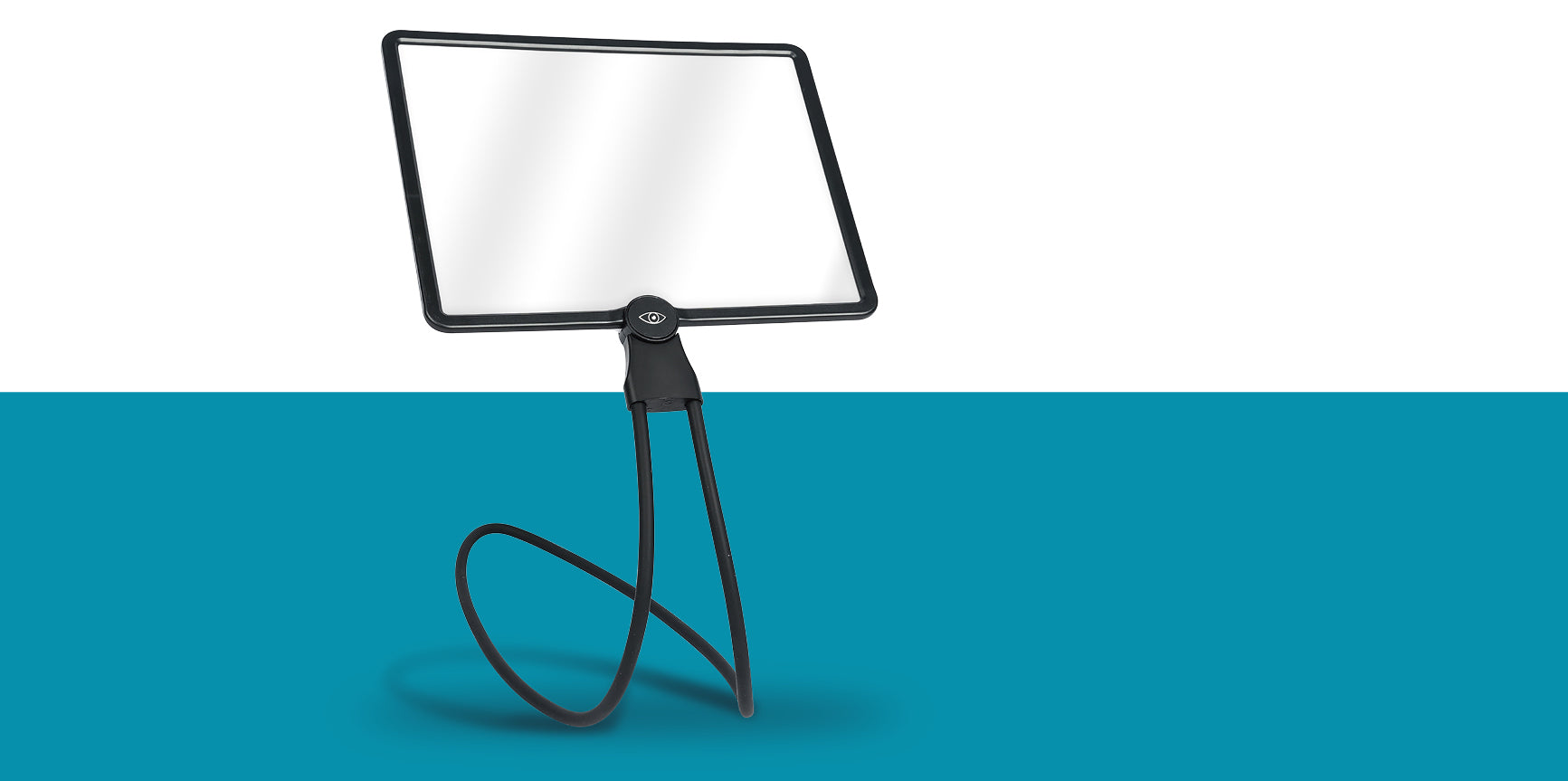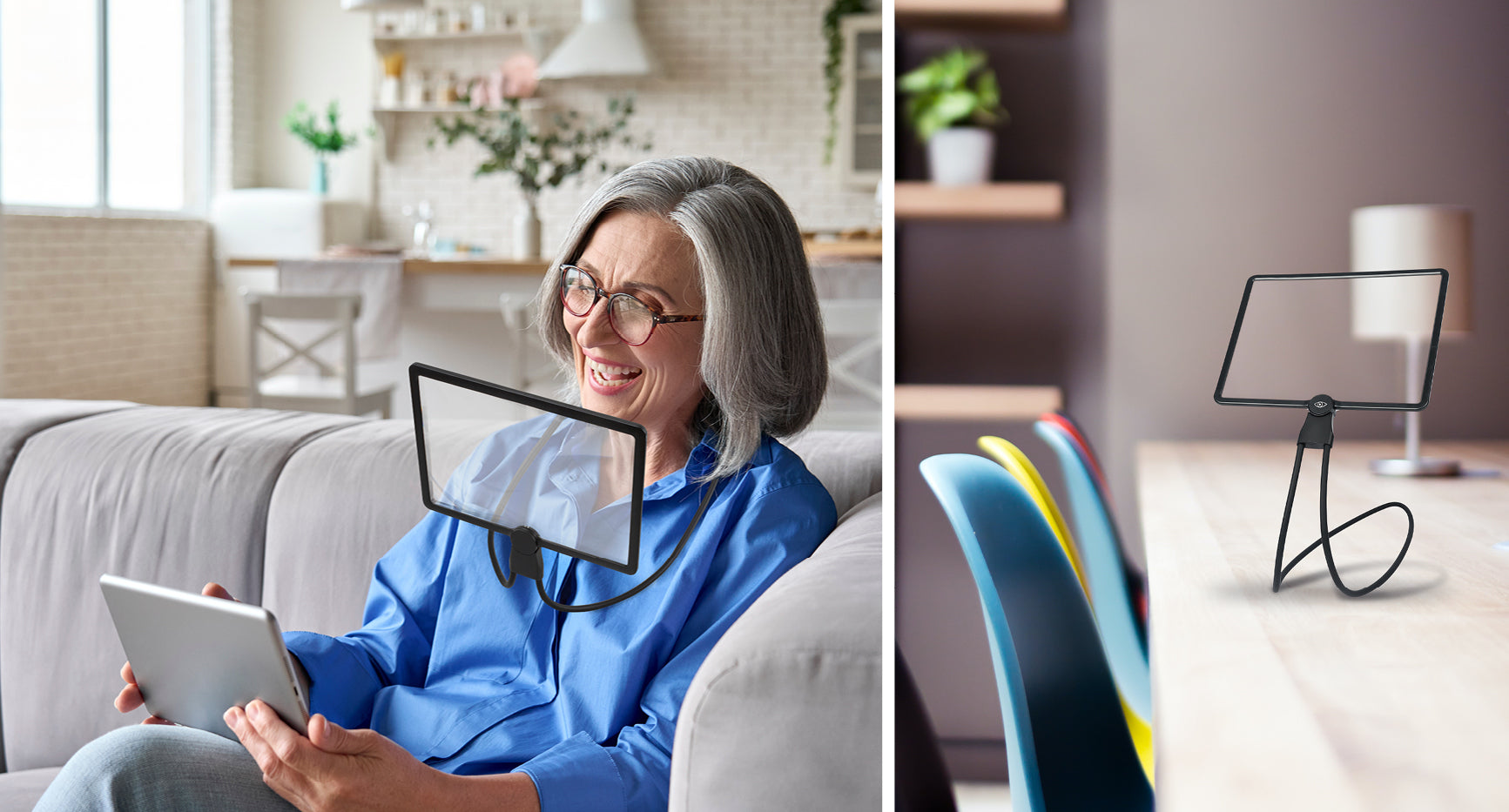 Flexibel verstellbar: Gelenk-Schlaufe für Benutzung um den Hals oder auf dem Tisch