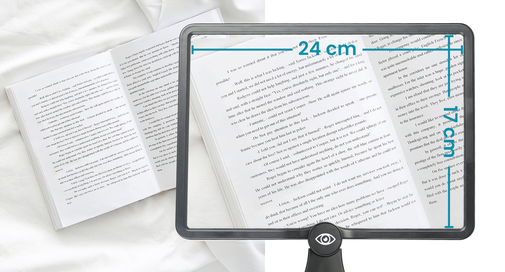 Die Ganzseitenlupe WPM-1 bietet Ihnen mit ihrem großen Linsen-Format von 24 x 17 Zentimetern ein großzügiges Sichtfeld. Diese Größe ermöglicht es Ihnen, eine gesamte Buchseite oder ein großes Dokument auf einmal zu vergrößern, ohne die Lupe ständig verschieben zu müssen. Genießen Sie so ein komfortables und kontinuierliches Leseerlebnis.